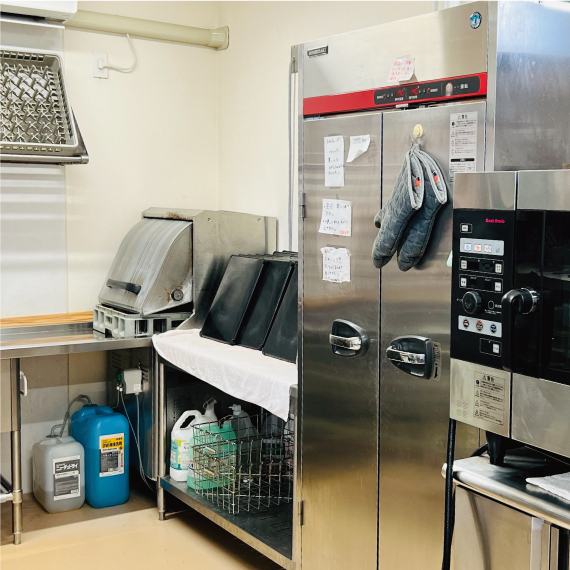 毎日ご提供する食事は栄養管理された安心メニュー。塩分など食事制限や刻み食、ミキサー食の対応も対応。施設内で調理しています。